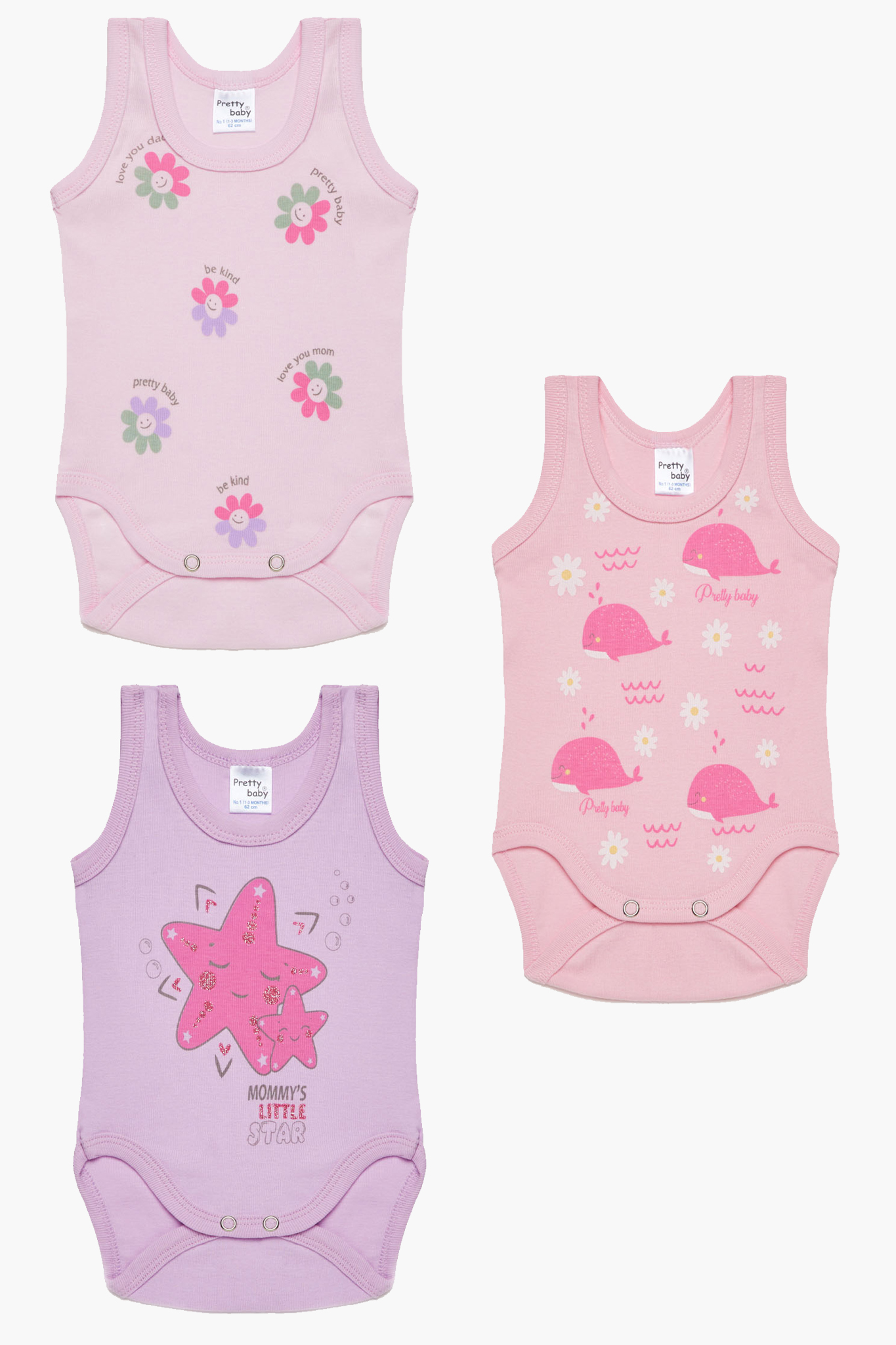 Βρεφικά εσώρουχα Αστερίας. Συσκευασια 3 χρωματιστά Κορμάκια τιράντα, Βαμβακερα 100%