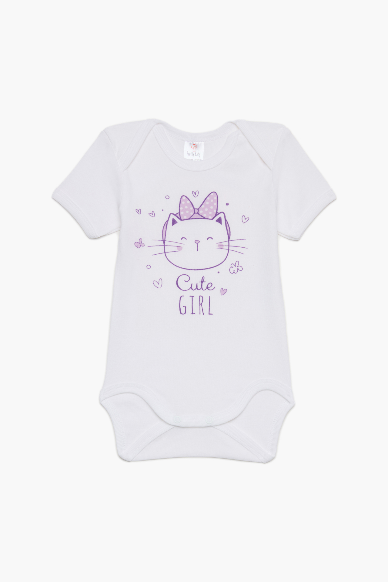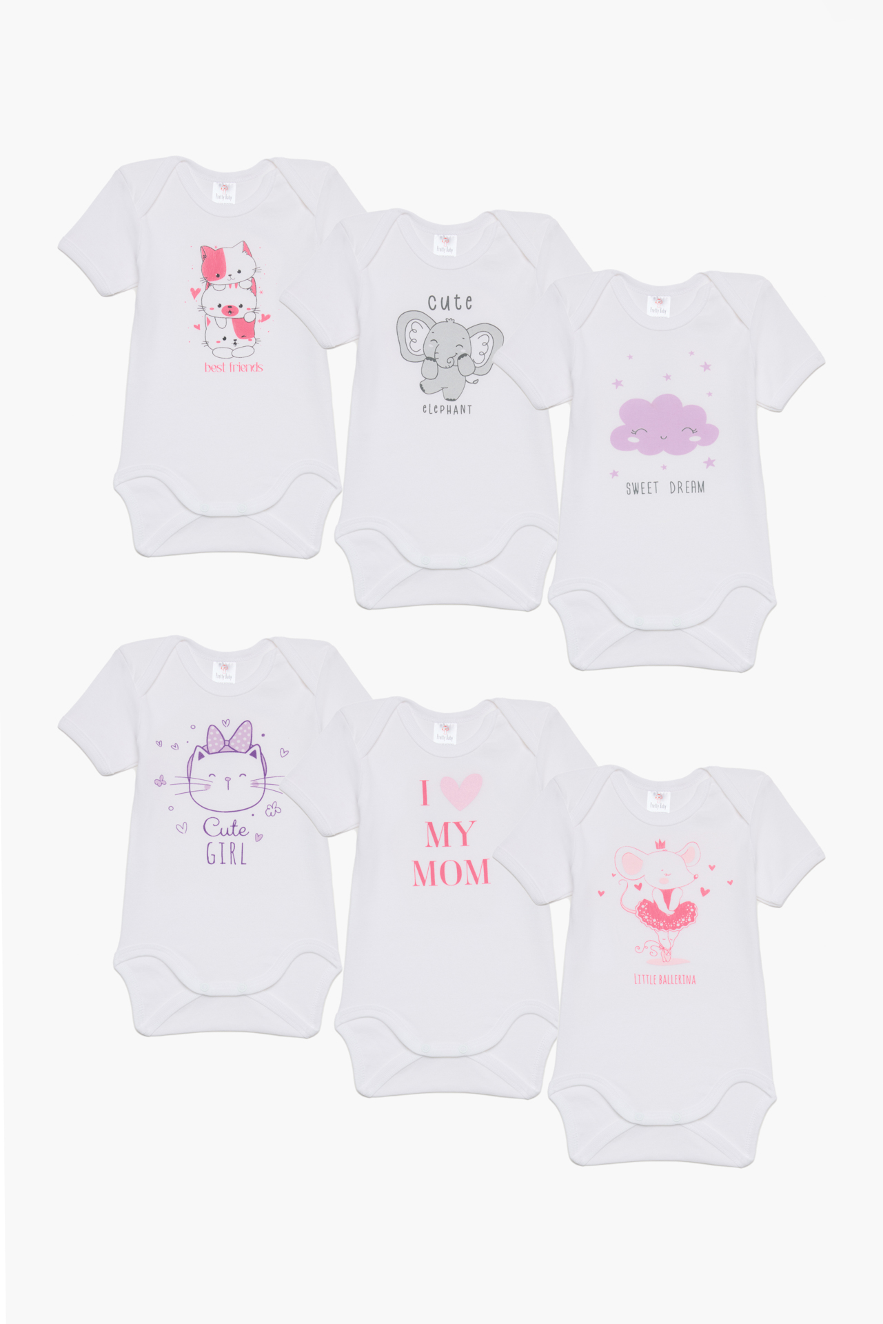 Βρεφικά κοντομάνικα κορμάκια για κορίτσια, χωρίς πλαϊνές ραφές που αντέχουν στον χρόνο, προσφέροντας άνεση στο μωρό. Η συσκευασία διαθέτει 6 τεμάχια σε λευκό χρώμα, με διαφορετικά τυπώματα, χωρίς τοξικές ουσίες. Επίσης διαθέτουν κουμπάκια στο κάτω μέρος για να κάνουν εύκολη την αλλαγή πάνας. Κατασκευάζονται από 100% πενιέ βαμβάκι που επιτρέπει στο σώμα να αναπνέει.