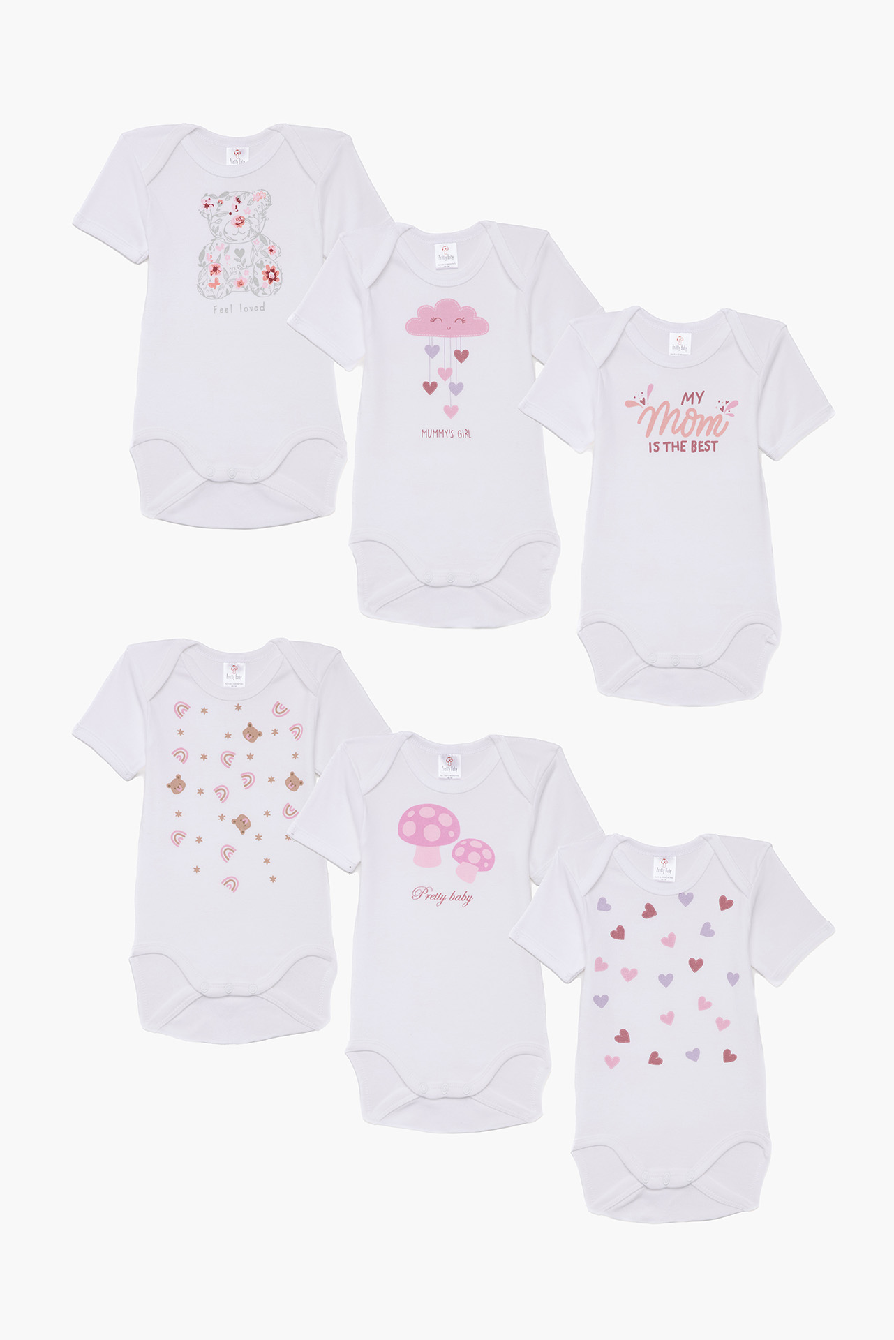 Βρεφικά κοντομάνικα κορμάκια για κορίτσια, χωρίς πλαϊνές ραφές που αντέχουν στον χρόνο, προσφέροντας άνεση στο μωρό. Η συσκευασία διαθέτει 6 τεμάχια σε λευκό χρώμα, με διαφορετικά τυπώματα, χωρίς τοξικές ουσίες. Επίσης διαθέτουν κουμπάκια στο κάτω μέρος για να κάνουν εύκολη την αλλαγή πάνας. Κατασκευάζονται από 100% πενιέ βαμβάκι που επιτρέπει στο σώμα να αναπνέει.