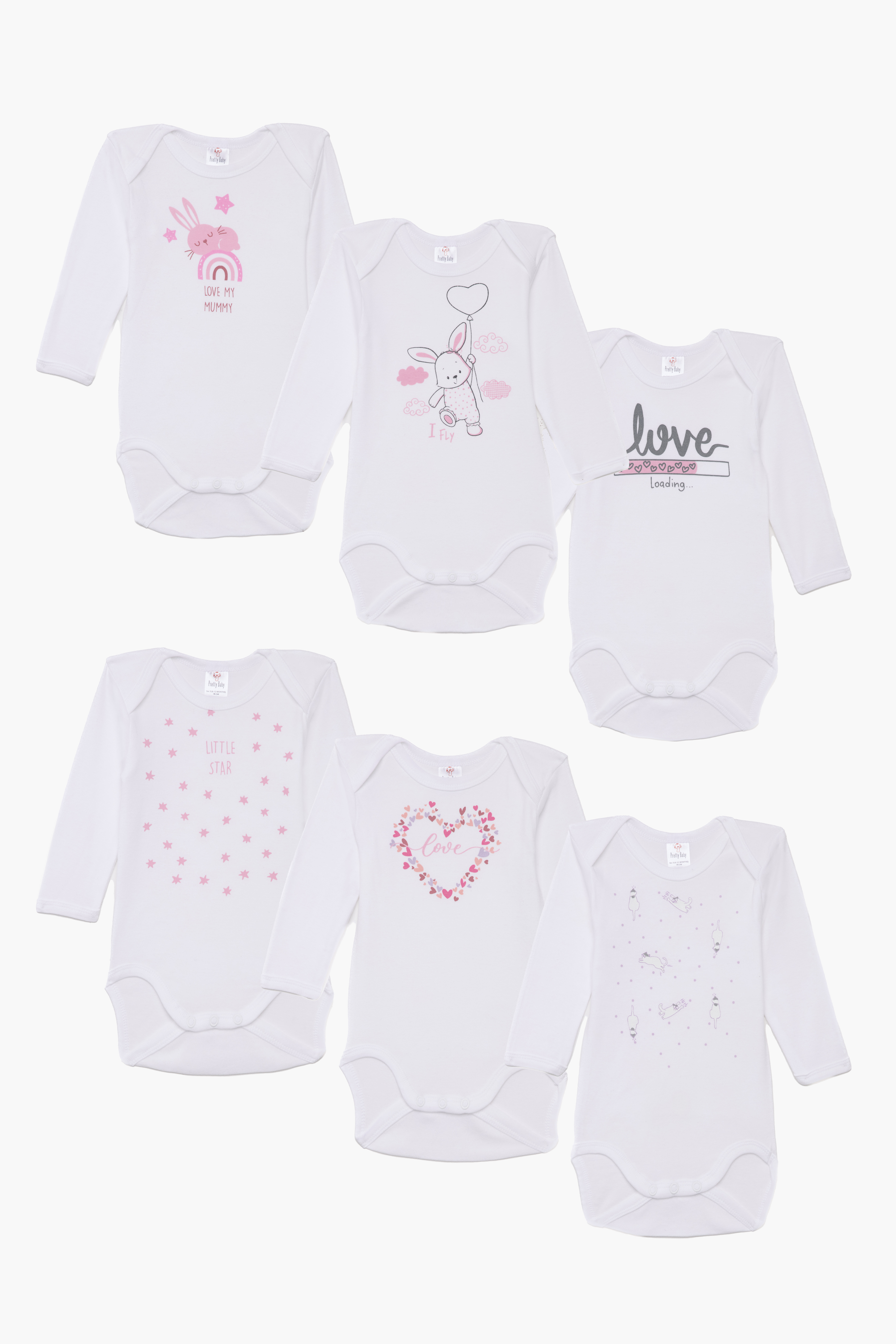 Βρεφικά εσώρουχα. Συσκευασία 6 τεμαχίων.βρεφικά κορμάκια μακρύ μανίκι Love, Βαμβακερά 100%