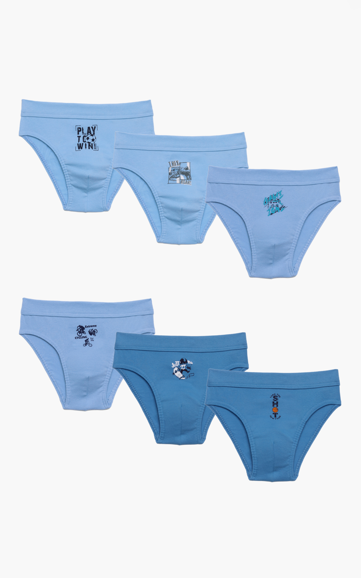 Παιδικά σλιπάκια για αγόρια, σχεδιασμένα για άνεση και αντοχή στον χρόνο. Η συσκευασία διαθέτει 6 τεμάχια σε αποχρώσεις του μπλε, με διαφορετικά τυπώματα, χωρίς τοξικές ουσίες. Κατασκευάζονται από 100% πενιέ βαμβάκι που επιτρέπει στο σώμα να αναπνέει.