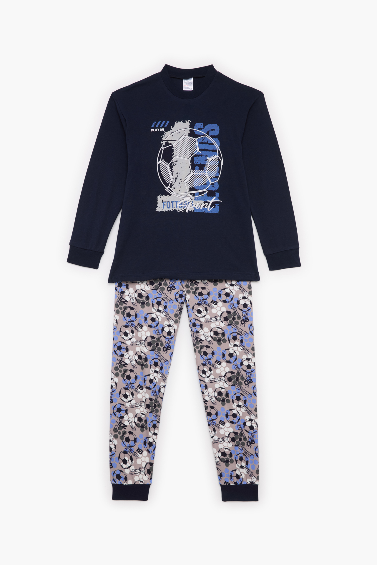 Παιδική χειμερινή πυζάμα για αγόρια, από 100% βαμβάκι, βγαίνει σε δύο διαφορετικές χρωματικές παραλλαγές και περιλαμβάνει, μπλούζα με ελαστική λαιμόκοψη και διακοσμητικό τύπωμα στο στήθος χωρίς τοξικές ουσίες, και μακρύ παντελόνι. Κατασκευάζεται από 100% πενιέ βαμβάκι που επιτρέπει στο σώμα να αναπνέει. Αντέχει στο πλύσιμο και δεν χάνει την ελαστικότητα και την άνετη φόρμα του.